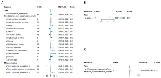 Similarly, for other taxa with suggestive or nominal associations (e.g., Alistipes, Bifidobacterium catenulatum–pseudocatenulatum complex), the estimates remained directionally consistent across sensitivity methods, with no evidence of pleiotropy or outlier influence. Detailed results for all taxa are summarized in Supplementary Tables S5–S7.