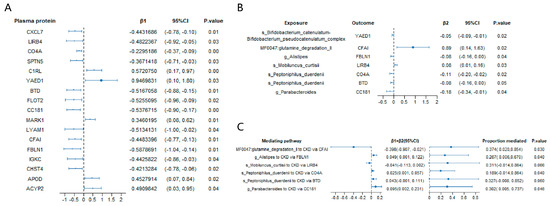 Furthermore, the mediation analysis revealed that the proportion of the mediation effect of genus Alistipes on CKD risk through the protein FBLN1 was 26.70% (95% CI = 0.006 to 0.6700, p = 0.04) (Figure 4C). The mediation effect of the genus Parabacteroides on CKD risk through protein CC181 was 30.20% (95% CI = 0.005 to 0.737, p = 0.05). Similarly, species Peptoniphilus duerdenii had a mediation effect on CKD risk through protein CO4A of 18.90% (95% CI = 0.005 to 0.737, p = 0.05). Finally, the mediating effect of the gut metabolic module (GMM) glutamine degradation II on CKD risk via protein CFAI was 37.40% (95% CI = 0.020 to 0.854, p = 0.03) (Figure 4C).