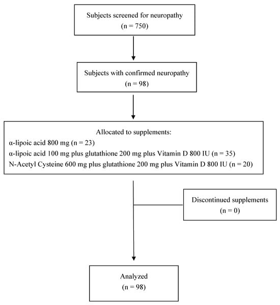 - Emara, S.M.; Fahmy, S.F.; AbdelSalam, M.M.; El Wakeel, L.M. Effect of high-dose N-acetyl cysteine on the clinical outcome of patients with diabetic peripheral neuropathy: A randomized controlled study. Diabetol. Metab. Syndr. 2025, 17, 79. [Google Scholar] [CrossRef] [PubMed]