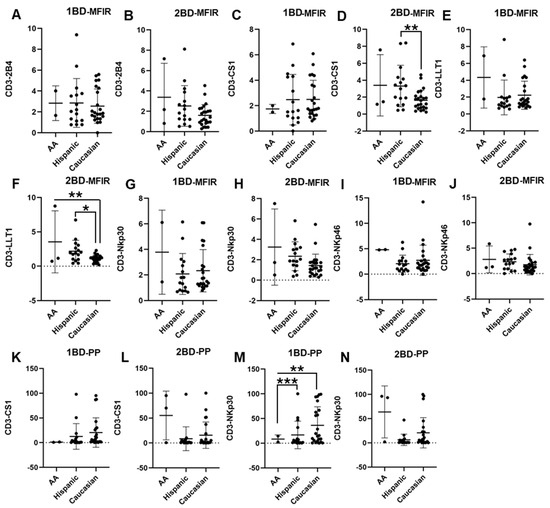 Differential expression of immune receptors on T cells of Hispanic, Caucasian, and African American ALL subjects before and after chemotherapy treatment. Flow cytometry analysis exhibits the cell surface expressions of 2B4 (A,B), CS1 (C,D), LLT1 (E,F), NKp30 (G,H), and NKp46 (I,J) on T cells of Hispanic, Caucasian, and African American ALL subjects pre- and post-chemotherapy treatments, as indicated by median fluorescence intensity ratio (MFIR). Flow cytometry analysis shows the percentage of positive (PP) cells expressing CS1 (K,L) and NKp30 (M,N) on T cells. The first blood draw is referred to as 1BD, which is collected at diagnosis or before the start of chemotherapy (day 0). The second blood draw is referred to as 2BD, which is collected at the end of induction chemotherapy or after treatment (day 29). * p < 0.05; ** p < 0.01; *** p < 0.001.