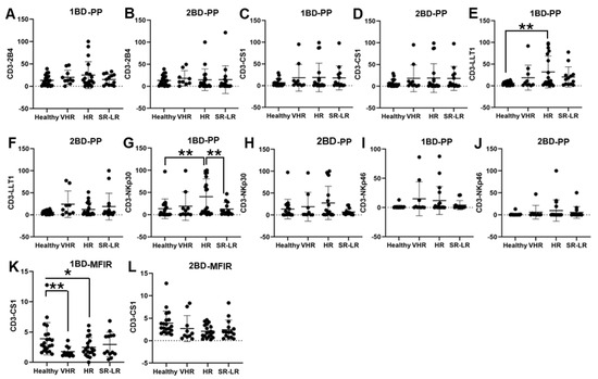 ALL subjects were stratified into risk-of-relapse groups and were designated as very high-risk (VHR), high-risk (HR), or standard risk/low-risk (SR-LR) and the cell surface immune receptor expression on CD3+ T cells was determined. The risk stratification was based on the subject’s MRD status, age, white blood cell count, CNS status, DNA index, ALL subtype, hyperdiploidy, hypodiploidy, TEL/AML status, MLL translocations, Philadelphia (Ph) chromosome, t(1;19) translocation, and additional chromosomal abnormalities. The immune receptor expression was determined in both healthy (only one sample) and ALL subjects at diagnosis (day 0, 1BD) and post-induction chemotherapy (day 29, 2BD). As shown in Figure 2E, LLT1 was observed to be significantly overexpressed in CD3+ T cells of high-risk ALL (31.67%) subjects as compared to healthy (5.8%) subjects (p < 0.01) at diagnosis (day 0, 1BD), which dropped down post-induction chemotherapy (day 29, 2BD) treatment to comparable levels of expression (12.17%) with healthy subjects (Figure 2F). Similarly, cell surface expression of NKp30 was significantly upregulated on T cells of high-risk patients (40.55%) at diagnosis (1BD) as compared to standard risk/low-risk and healthy (13.4%) subjects (Figure 2G). NKp30 expression on T cells in high-risk subjects decreased to 27.3% following chemotherapy (2BD) treatment (Figure 2H). In contrast, CS1 expression on CD3+ T cells, measured by median fluorescence intensity ratio (MFIR), was significantly reduced at diagnosis (day 0, 1BD) in both very high-risk (1.76) and high-risk (2.47) ALL patients compared to healthy (3.89) individuals (Figure 2K). After induction chemotherapy (day 29, 2BD) there was no significant difference in CS1 expression on T cells in the different risk-stratified groups (very high-risk = 2.7, high-risk = 2.09, and standard risk/low-risk = 2.33) of ALL subjects as compared to healthy (3.89) subjects (Figure 2L). There was no significant difference in the percentage of positive cell expression of 2B4, CS1 and NKp46 on CD3+ T cells in the different risk-stratified groups of ALL subjects as compared to healthy subjects either at diagnosis (1BD) or post-induction chemotherapy (2BD) treatment (Figure 2A–D,I,J).