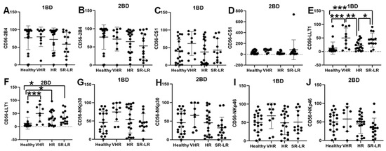 LLT1 cell surface expression was significantly elevated in CD56+ NK cells of very high-risk (49.91% and 49.77%) and standard risk/low-risk (34.64% and 31.38%) ALL subjects at diagnosis (1BD) and after chemotherapy (2BD), respectively, as compared to healthy (12.64%) subjects (Figure 3E,F). CD56+ NK cells from very high-risk ALL patients at diagnosis showed elevated expression of CS1 (61.34%), NKp30 (74.65%), and NKp46 (68.17%) as compared to healthy subjects (39.84%, 46.1%, and 49.9%, respectively), but it was not statistically significant (Figure 3C,G,I).