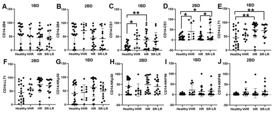 Cell surface expression of 2B4, CS1, LLT1, NKp30, and NKp46 on CD14+ monocytes of high-risk ALL subjects before and after chemotherapy treatments. Flow cytometry analysis of cell surface expression indicated by percentage of positive cells expressing 2B4 (A,B), CS1 (C,D), LLT1 (E,F), NKp30 (G,H), and NKp46 (I,J) on monocytes of ALL subjects before and after chemotherapy treatments, stratified by risk-of-relapse. The first blood draw is referred to as 1BD, which is collected at diagnosis or before the start of chemotherapy (day 0). The second blood draw is referred to as 2BD, which is collected at the end of induction chemotherapy or after treatment (day 29). * p < 0.05, ** p < 0.01.