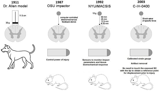 From 1911 to the present, devices for spinal cord contusion injury in animals have evolved from simple mechanical to modern electronic devices. The latest ones allow control and standardisation of the extent of injury to limit variation between animals and to more adequately compare results obtained in different laboratories. The chronology of development and the most common modern impactors are shown in Figure 2 and Figure 3 [17].