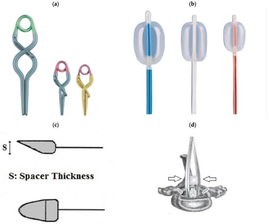 (a): Aneurysm clips. (b): Fogarty catheter. (c): Spacer. (d): Calibrated forceps. Arrows indicate the direction of compression. (c,d) cited by [17]. Use permitted under CC BY-NC 4.0.