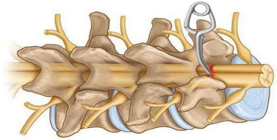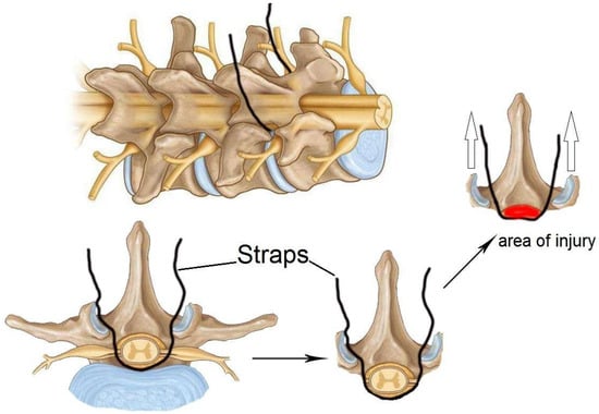 In 2008, an alternative compression model that does not necessitate laminectomy was proposed: spinal cord strapping [50]. This model results in a minimally invasive spinal cord injury that mimics a spinal cord injury due to increased pressure in the spine (Figure 11).