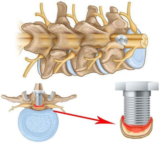 It is also pertinent to mention compression models of SCI that do not require laminectomy. Of note is the screw compression model (Figure 10), which was first described in 2008 [44]. A small plastic or titanium flat-bottomed screw (0.5 mm pitch, 3 mm diameter, and 9 mm height) is employed for inducing spinal cord injury and is drilled through the lamina in the desired region subsequent to the removal of the spinous process. The screw is then left slightly exposed or sutured until the next procedure. At each interval, the screw is rotated in order to increase compression by 0.1 to 0.5 mm with each rotation. This procedure is typically performed every 7–14 days for a period of 2 months [6,45,46,47,48,49].