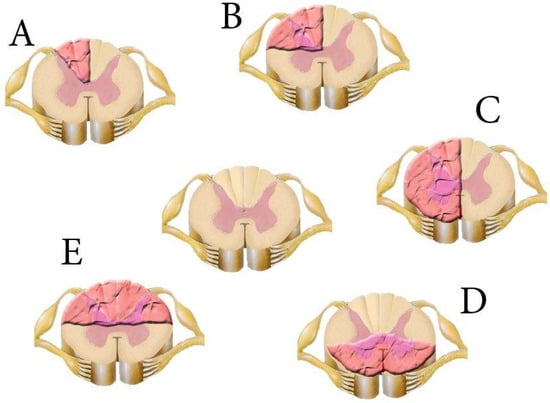 Models of spinal cord transection (pink wavy area). (A)—dorsal funiculi transection; (B)—dorsolateral funiculus transection; (C)—lateral hemisection; (D)—ventral column lesion; (E)—dorsal column lesion. The intact spinal cord is in the centre.