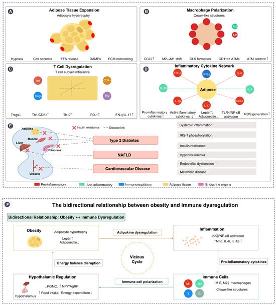 Immunometabolic interactions in obesity and bidirectional relationship with immune dysregulation. (A) Adipose tissue expansion: Obesity-induced adipocyte hypertrophy leads to tissue hypoxia, cell necrosis, free fatty acid (FFA) release, damage-associated molecular patterns (DAMPs) production, and extracellular matrix (ECM) remodeling, creating a proinflammatory microenvironment. (B) Macrophage polarization: Adipose tissue macrophages (ATMs) undergo polarization from the anti-inflammatory M2 phenotype to the proinflammatory M1 phenotype, with increased CCL2 expression facilitating macrophage recruitment and formation of crown-like structures (CLS) around dying adipocytes, characterized by CD11c+ ATMs accumulation. (C) T cell dysregulation: Obesity disrupts T cell subset balance, characterized by decreased regulatory T cells (Tregs↓) and increased proinflammatory T cell populations (Th1↑, CD8+↑, Th17↑), along with elevated PD-1 expression and increased production of inflammatory mediators (IFN-γ↑, IL-17↑). (D) Inflammatory cytokine network: Adipose tissue becomes the central hub of inflammatory signaling, with increased production of proinflammatory cytokines (TNF-α, IL-6, IL-1β, CCL2) and decreased anti-inflammatory cytokines (IL-10, IL-4). This is accompanied by altered adipokine secretion (leptin↑, adiponectin↓), TLR4/NF-κB pathway activation, and reactive oxygen species (ROS) generation. (E) Systemic inflammation and metabolic consequences: Obesity-induced chronic inflammation affects multiple target organs including muscle, liver, pancreas, and blood vessels, leading to insulin resistance and the development of metabolic diseases including type 2 diabetes, NAFLD, and cardiovascular disease through interconnected pathological pathways. (F) Bidirectional relationship forming a vicious cycle: Obesity and immune dysregulation create a self-perpetuating cycle where obesity promotes inflammation through adipokine dysregulation and tissue dysfunction, inflammation disrupts immune cell function and promotes further metabolic dysfunction, and hypothalamic inflammation impairs central energy regulation (POMC↓, NPY/AgRP↑), leading to increased food intake and decreased energy expenditure. This energy imbalance exacerbates obesity, completing the vicious cycle. Arrows: → indicate direct effects or pathways; ↔ indicate reciprocal interactions; symbols: ↑ indicates increased/upregulated; ↓ indicates decreased/downregulated. Figure designed by authors.