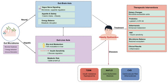 Multi-axial mechanisms of gut microbiota regulation of obesity and therapeutic intervention strategies. This figure illustrates key pathways through which gut microbiota influences metabolic health via neural and hepatic pathways. The gut–brain axis affects metabolic function through vagus nerve signaling, appetite regulation, and energy balance, while the gut–liver axis participates in metabolic risk regulation through bile acid metabolism, FXR regulation, and insulin sensitivity. Gut microbiota dysbiosis can lead to obesity dysfunction, which in turn triggers various metabolic diseases such as T2DM, NAFLD, and CVD. Right side of the figure presents therapeutic intervention strategies targeting gut microbiota, including dietary modifications, probiotic supplementation, Akkermansia, fecal microbiota transplantation, and microbiota balancing. These interventions can reduce inflammatory responses and improve metabolic outcomes. Figure designed by authors.