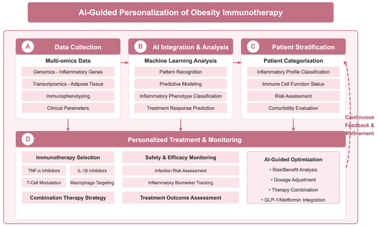 AI-assisted personalized decision-making framework for obesity immunotherapy. Framework achieves precision therapy through four key stages: (A) data collection stage, which integrates multi-omics data such as genomics, transcriptomics, immunophenotyping, and clinical parameters; (B) AI integration and analysis stage, which leverages machine learning for pattern recognition, predictive modelling, classification of inflammatory phenotypes, and prediction of therapeutic response; (C) patient stratification stage, which provides individual classification based on inflammation profiles, immune cell functional status, risk assessment, and comorbidity assessment; and (D) personalized treatment and monitoring phase, guiding immunotherapy selection (e.g., TNF-α inhibitors, IL-1β inhibitors, etc.), safety monitoring and treatment efficacy assessment, and AI-guided risk-benefit analysis, dosage adjustment, and optimization of combination therapy strategies. A continuous feedback and optimization mechanism (dotted line on the right) ensures that treatment regimens are dynamically adjusted according to patient response. Figure designed by authors.