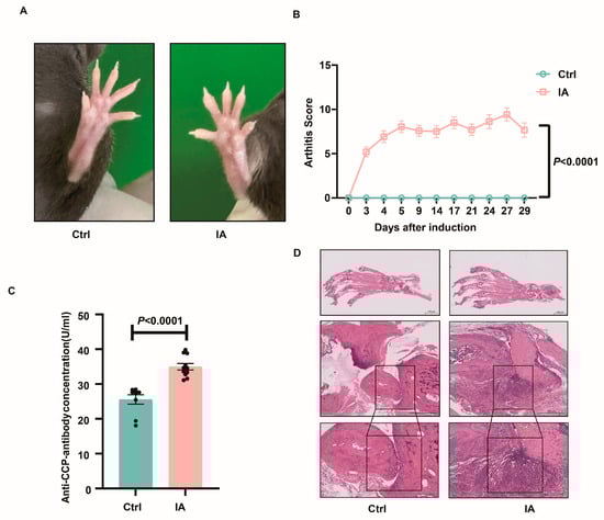 Establishment of the IA model. (A) Representative images of the paws after IA inductions. (B) Joint scores recorded before and after IA induction, showing significantly higher scores in the IA group compared to the Ctrl group. (C) ELISA quantification of plasma anti-CCP levels, demonstrating elevated expression in IA mice. (D) Histopathological examination of joint tissue by H&E staining confirms IA-associated joint pathology. Synovial hyperplasia and extensive inflammatory cell infiltration in the joint cavity of IA mice (black frame).