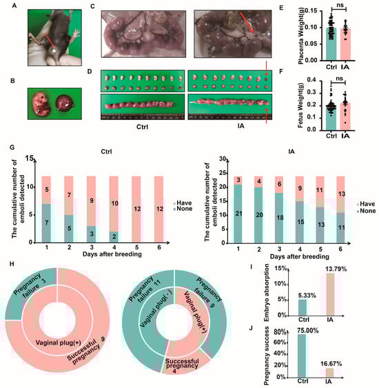 Establishment of the IA pregnancy model. (A) Representative image of a vaginal plug, indicating successful mating (red arrow). (B) Representative image showing the fetus, umbilical cord, and placenta. (C) Representative image showing the uterine morphology of Ctrl and IA mice on day 15 of pregnancy, with the red arrow indicating a dead/resorbed fetus surrounded by adipose tissue. (D) Representative image of the fetus and placenta from Ctrl and IA group pregnancies, with the red arrow indicating a dead/resorbed fetus surrounded by adipose tissue. (E) Graph comparing placenta weights between the Ctrl and IA groups. (F) Graph comparing fetal weights between the Ctrl and IA groups. (ns: not significant, p > 0.05) (G) Cumulative number of successful vaginal plugs observed in 12 female Ctrl and 24 female IA mice. (H) Summary of vaginal plug detection and pregnancy status in 12 female Ctrl mice and 24 female IA mice. (I) Graph comparing embryo resorption rates between the Ctrl and IA groups. (J) Graph comparing pregnancy success rates between the Ctrl and IA groups.