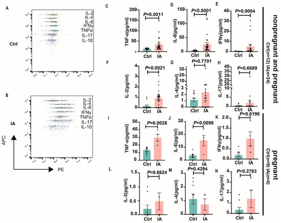Plasma cytokine expression analysis in IA mice. (A) Representative flow cytometry plot of cytokine expression in a Ctrl group sample. (B) Representative flow cytometry plot of cytokine expression in an IA group sample. (C–F) Graphs illustrating the expression levels of Th1-related cytokines TNFα (C), IL-6 (D), IFNγ (E), and IL-2 (F) in the Ctrl and IA groups. (G) Graph showing the expression of Th2-related cytokine IL-4 in the Ctrl and IA groups. (H) Graph showing the expression of Th17-related cytokine IL-17 in the Ctrl and IA groups. (I–L) Graphs illustrating the expression levels of Th1-related cytokines TNFα (I), IL-6 (J), IFNγ (K), and IL-2 (L) in the pregnant Ctrl and IA groups. (M) Graph showing the expression of Th2-related cytokine IL-4 in the pregnant Ctrl and IA groups. (N) Graph showing the expression of Th17-related cytokine IL-17 in the pregnant Ctrl and IA groups.