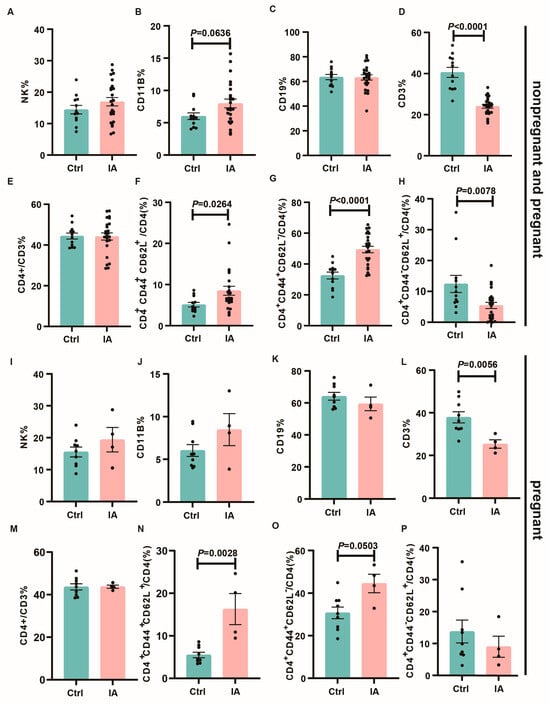 Flow cytometry was then utilized to identify immune cell populations within the spleens and mesenteric draining lymph nodes (DLNs). Compared to the Ctrl group, IA mice demonstrated increased frequencies of NK cells (13.57 (11.50, 17.37) vs. 16.51 (14.18, 19.72), p = 0.311) and CD11b+ myeloid cells (5.7 (4.88, 7.14) vs. 7.16 (6.58, 9.39), p = 0.0636), whereas CD3+T cells (41.34 (35.20, 45.99) vs. 24.26 (22.25, 25.91), p < 0.0001) exhibited decreased frequencies, with no significant alterations observed in B cells (64.30 (58.89, 68.18) vs. 64 (58.84, 67.61), p = 0.987) or CD4+ T cells (44.46 (41.11, 47.67) vs. 44.98 (40.54, 47.77), p = 0.753). Enhanced activation of both CD4+ T cells was observed, along with increases in effector memory (Tem, CD44+CD62L−) (34.93 (27.58, 37.50) vs. 51.26 (45.06, 53.76), p < 0.0001) and central memory (Tcm, CD44+CD62L+) T cells (4.48 (3.88, 6.34) vs. 6.67 (6.26, 10.75), p = 0.0264), whereas naïve (Tn, CD44−CD62L+) T cells (9.24 (6.31, 18.52) vs. 5.61 (3.41, 7.50), p = 0.0078) exhibited decreased levels (Figure 4A–H). This trend was similarly observed in the subgroup of successfully pregnant mice (Figure 4G–P).