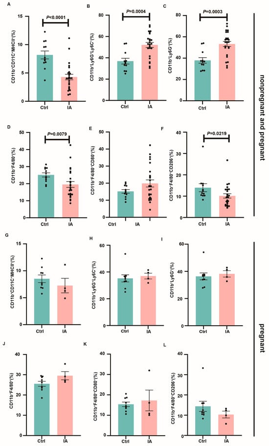 Regarding myeloid immune cell subsets, IA mice exhibited higher proportions of monocytes (35.48 (30.96, 42.79) vs. 53.05 (47.22, 56.96), p = 0.0004), neutrophils (36.76 (32.20, 43.59) vs. 55.14 (48.35, 58.23), p = 0.0003), and M1 macrophages (14.95 (12.86, 17.51) vs. 17.31 (15.54, 24.19), p = 0.416) in both the spleen and DLNs, while dendritic cells (7.55 (6.65, 9.71) vs. 4.07 (3.27, 5.29), p < 0.0001) and M2 macrophages (11.98 (9.82, 18.13) vs. 9.38 (8.03, 12.23), p = 0.0219) were reduced (Figure 5A–F). Moreover, in the spleen and mesenteric DLNs of successfully pregnant mice, the trends in myeloid immune cell subset expression were similar between the Ctrl and IA groups, although the differences were not statistically significant (Figure 5G–L).