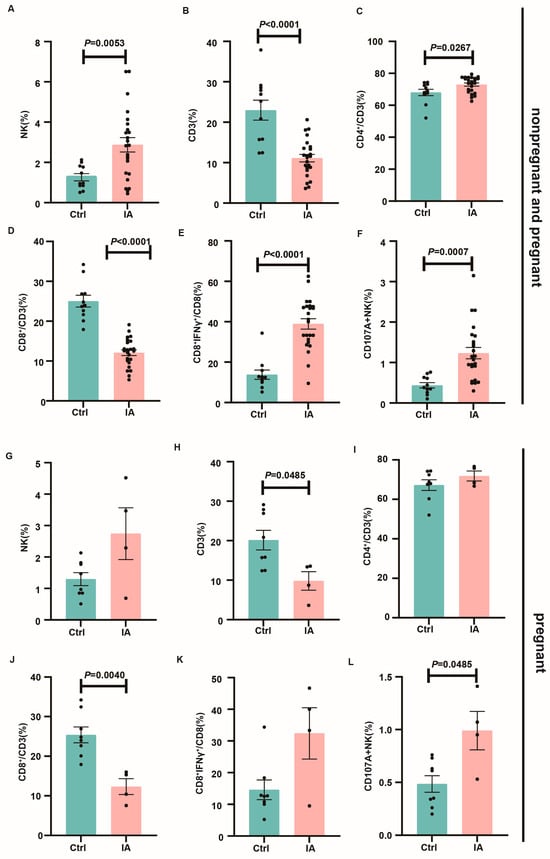 T cell and NK cell subpopulations in the spleen and lymph nodes. (A–F). Bar charts depicting the proportions of NK (A), CD3 (B), CD4 (C), CD8 (D), Tc1 (E), and CD107A+ NK cells (F) in the spleen of Ctrl (n = 12) and IA (n = 24) mice. (G–L). Bar charts depicting the proportions of NK (G), CD3 (H), CD4 (I), CD8 (J), Tc1 (K), and CD107A+ NK cells (L) in the spleen of pregnant Ctrl (n = 9) and IA (n = 4) mice.