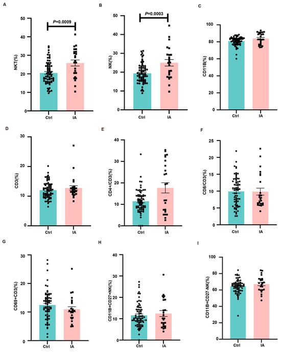 Immune cell subpopulations in the placenta. (A–I). Bar charts showing the proportions of NKT (A), NK (B), CD11b (C), CD3 (D), CD4 (E), CD8 (F), CD69+CD3 (G), CD11b+CD27+/NK (H), and CD11b+CD27−/NK (I) cells in the placenta of Ctrl (n = 68) and IA (n = 24) mice.
