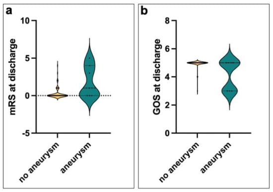 Functional outcome at discharge in patients with and without aneurysmal pathology. The violin plots show the distribution of modified Rankin scale (mRS) scores (a) and Glasgow Outcome Scale (GOS) scores (b) at hospital discharge, stratified by aneurysm status. While the outcome distribution in patients without aneurysms was tightly clustered around favorable values, the aneurysm group showed a significantly broader distribution with a tendency towards worse outcomes. This pattern reflects greater heterogeneity and more frequent functional impairment in the presence of aneurysmal pathology. Dotted lines indicate medians and shaded areas indicate the density of data points.