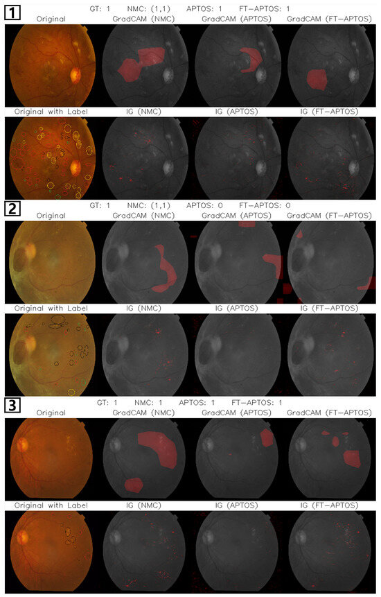 Overall, IG results show that the NMC-trained model focuses sharply on lesions like hemorrhages and microaneurysms, closely matching expert annotations. The APTOS-trained model displays broader, less specific attention as it concentrates primarily on severity criteria rather than precise lesion identification, resulting in insufficient feature focusing for its classification decisions. When both approaches are combined in the FT-APTOS model, we observe more refined localization, with the lesion-specific knowledge from NMC complementing the severity-based approach of APTOS to support more informed model decision-making. This suggests that lesion-focused pretraining improves clinical feature alignment and classification accuracy by enhancing the model’s ability to identify the specific pathological features that drive severity assessment. While these findings demonstrate the benefits of combining approaches, challenges remain in fully bridging lesion detection and severity classification, suggesting opportunities for future research using mechanisms like multi-task learning or hierarchical supervision.