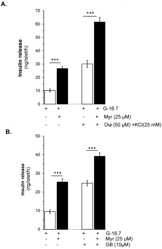 Effects of myricetin on insulin secretion in (A), depolarized with Diazoxide- and KCl, and (B) Glibenclamide (GB)-treated mice islets. Islets were incubated in 16.7 mM glucose in the presence or absence of myricetin (25 μM) and/or diazoxide (50 μM) + KCl (25 mM) and GB (10 μM). The mean and SEM for the analysis were calculated based on 3 independent experiments conducted in triplicates. *** p < 0.001, significant changes over the respective control values.
