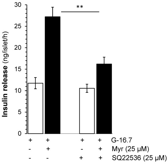 To evaluate the effect of myricetin on the activation of adenylate cyclase or upstream to the adenylate cyclase, we used SQ22536 (25 µM), which possesses an adenylate cyclase inhibitor effect on the myricetin-induced insulin secretion. The results showed that SQ22536 reduced the myricetin-induced insulin secretion significantly (17.21 ± 1.7 vs. 27.21 ± 2.2 ng/islet/h, p < 0.001), but not completely (Figure 4).