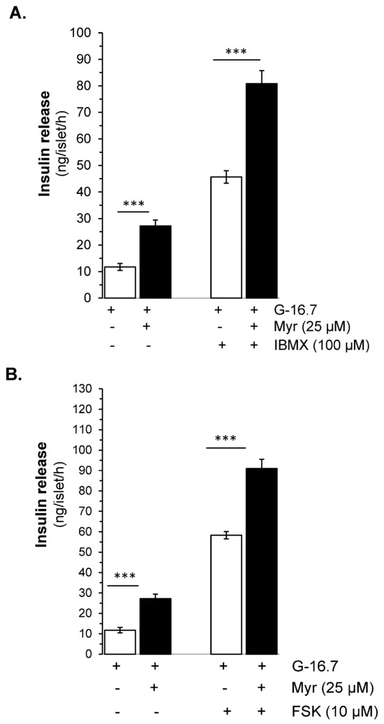The inhibition by SQ22536 is significant but incomplete, which led us to investigate myricetin’s effect on downstream signaling pathways. We evaluated whether myricetin affects occur on the inhibition of the production of cAMP by adenylate cyclase activation or the inhibition of the hydrolysis by phosphodiesterase. For both, we used the forskolin (FSK), an adenylate cyclase activator, and IBMX, a phosphodiesterase inhibitor. Interestingly, we found that myricetin further augmented the FSK-induced insulin secretion (91.23 ± 4.5 vs. 59.54 ± 1.7 ng/islet/h, p < 0.001), as shown in Figure 5B. Similarly, myricetin further amplifies the IBMX-induced insulin secretion (80.86 ± 4.9 vs. 53.12 ± 2.9 ng/islet/h, p < 0.001), as shown in Figure 5A.