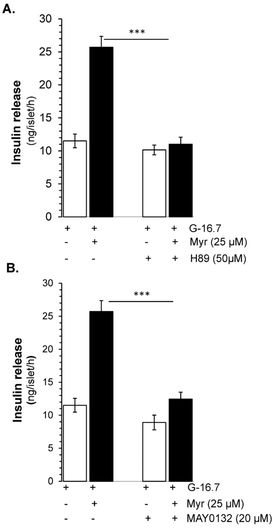 Due to the synergistic effect of Epac 2 and PKA [25] we further evaluated the effect of Epac 2 in myricetin-induced insulin secretion. Using the MAY 0132, an Epac-2 inhibitor, we found that the myricetin-induced insulin secretion was almost completely inhibited (12.45 ± 1.71 vs. 25.71 ± 1.7 ng/islet/h, p < 0.001) Figure 6B. Interestingly, the pattern of inhibition by Epact 2 is almost similar to the inhibition by PKA.
