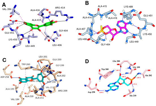 Molecular docking simulations of the ligand myricetin with the protein structure from MEK-1 kinase reveal a stable binding conformation characterized by a combination of hydrophobic interactions and hydrogen bonds. There are hydrophobic contacts of myricetin with several residues within the binding site, which contribute to the ligand’s stability by embedding myricetin within the hydrophobic core of the protein (Figure 8C). In addition to hydrophobic contacts, myricetin also interacts with LYS-97, VAL-127, GLY-128, PHE-209, VAL-211, and SER-212 via hydrogen bonding (Table 1).