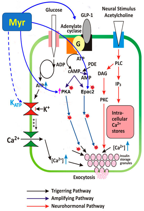 Furthermore, when investigating the myricetin-induced, glucose-dependent effect through amplifying signaling pathways, we used agonists and antagonists of the key amplifying signaling pathways. Among the insulin secretory amplifying pathways, the cAMP-PKA signaling pathway plays a central role in glucose-mediated insulin release, functioning in tandem with Ca2⁺ to regulate insulin secretion [30,31,32]. It is reported that myricetin acts as a GLP-1 receptor activator, hence leading to the insulin secretory effect [30,31,32]. However, in addition to its GLP-1 receptor agonist, our experimental evidence in isolated pancreatic islets showed that myricetin exhibited its dual glucose-dependent potential of the downstream signaling cascade, first inhibiting adenylate cyclase by SQ22536, where a significant but incomplete inhibitory effect in myricetin-induced insulin secretion was observed. Second, myricetin showed an additive effect in forskolin-induced insulin secretion, third, myricetin showed an additive effect in IBMX-induced insulin secretion, fourth, no significant inhibitory effect was observed by inhibiting the phospholipase C (PLC)/Protein Kinase C (PKC) signaling cascade, using U73122.