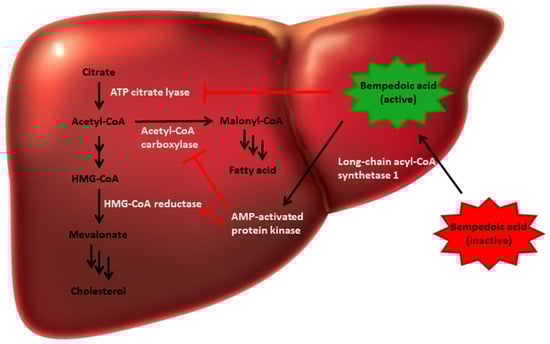 Bempedoic acid is an oral medication for the treatment of elevated LDL-C levels and is an alternative for patients who cannot tolerate statins due to muscle-related adverse effects. Its unique pharmacological profile involves the inhibition of hepatic ATP citrate lyase (ACLY) and the activation of adenosine monophosphate-activated protein kinase (AMPK), which act synergistically to reduce cholesterol synthesis in the liver. By selectively acting on the liver, bempedoic acid minimises off-target effects on skeletal muscle, improving its safety profile [19].
