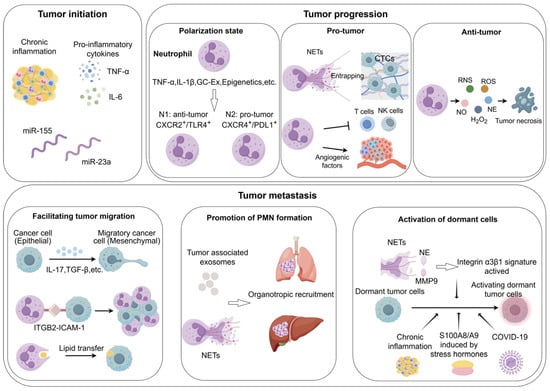 Neutrophils, accounting for 50–70% of circulating leukocytes, exhibit remarkable plasticity in tumor biology. Depending on tumor type and microenvironmental cues, they can exert either anti-tumor or pro-tumor effects. During tumor initiation, neutrophils exposed to chronic inflammation secrete cytokines and oncogenic microRNAs that promote genomic instability and malignant transformation. In tumor progression, neutrophils adopt context-dependent phenotypes and execute diverse functions, including polarization into anti-tumor (N1) or pro-tumor (N2) subsets; secretion of inflammatory and angiogenic mediators; formation of neutrophil extracellular traps (NETs); production of reactive oxygen and nitrogen species (e.g., H2O2 and nitric oxide); and modulation of immune cell infiltration and function within the tumor microenvironment. During metastasis, neutrophils facilitate cancer dissemination through three principal mechanisms: (1) promoting epithelial–mesenchymal transition (EMT) via inflammatory signaling, adhesion molecule interactions, and lipid metabolic support; (2) establishing pre-metastatic niches by remodeling distant organ stroma through NETs and matrix metalloproteinases; and (3) reactivating dormant tumor cells in response to chronic inflammation, viral infection, or stress hormones. Collectively, neutrophils function as central regulators across all stages of tumor evolution, influencing cancer growth, immune evasion, and metastatic progression. This review aims to provide a comprehensive synthesis of neutrophil-mediated mechanisms in the tumor microenvironment and highlight emerging strategies for neutrophil-targeted cancer therapy.