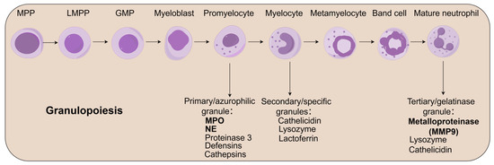 Developmental studies indicate neutrophils arise from lymphoid-primed multipotent progenitors (LMPPs) during hematopoietic differentiation, with LMPPs themselves being derived from multipotent progenitors (MPPs) [42]. These progenitors undergo stepwise differentiation through the granulocyte–monocyte progenitor (GMP) stage, a process regulated by a cascade of key transcription factors [40,43,44]. Terminal differentiation follows a strict morphological progression: myeloblast → promyelocyte → myelocyte → metamyelocyte → band cell → mature neutrophil [40,45,46,47]. Importantly, the granule assembly cascade initiates with primary (azurophilic) granule formation at the promyelocyte stage, followed by robust production of secondary (specific) granules in myelocytes, culminating in tertiary (gelatinase) granule generation during terminal neutrophil maturation [40,48]. These subcellular structures compartmentalize effector molecules such as myeloperoxidase, defensins, antimicrobial peptides, as well as proteolytic enzymes like elastase and matrix metalloproteinases (MMPs), playing dual roles in antimicrobial defense and tissue homeostasis regulation [48,49] (Figure 2).