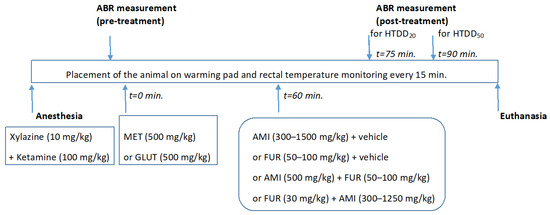 The aim of this study was to determine the influence of MET and GLUT on the ototoxicity induced by AMI+FUR in a hearing threshold model in mice using auditory brainstem responses (ABRs). The application of MET and GLUT was important because of the prophylaxis that could be used before the administration of the drugs, which can cause ototoxic side effects. Additionally, the direct comparison of the efficacy of MET and GLUT allows us to preselect the most active drug for the treatment of drug-induced hearing loss in this animal model to determine whether further preclinical studies are warranted.