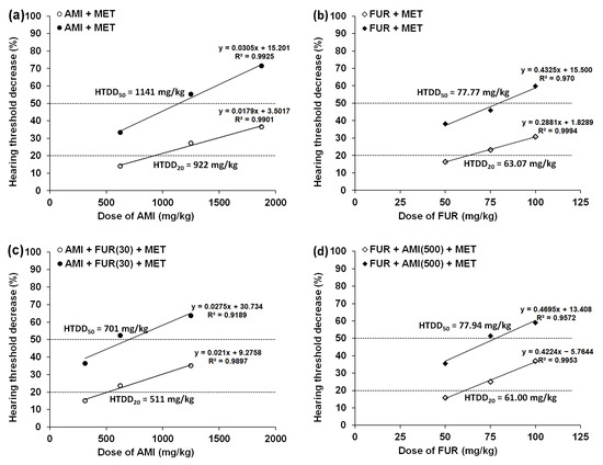 Dose-response relationship lines for MET on AMI- (a), FUR- (b), (AMI+FUR)- (c), and (FUR+AMI)- (d) induced hearing threshold decreases by 20% and 50% in experimental animals. Each point on the graphs represents a mean value of 6 animals. To calculate each HTDD20 or HTDD50 value, 18 mice (3 groups of 6 animals per group) underwent ABR measurements.
