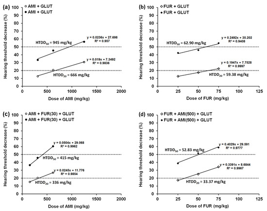 Dose-response relationship lines for GLUT on AMI- (a), FUR- (b), (AMI+FUR)- (c) and (FUR+AMI)- (d) induced hearing threshold decreases by 20% and 50% in the experimental animals. Each point on the graphs represents a mean value of 6 animals. To calculate each HTDD20 or HTDD50 value, 18 mice (3 groups of 6 animals per group) underwent ABR measurements.