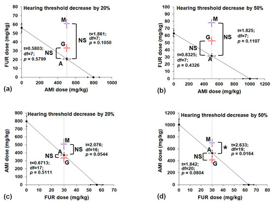 Isobolographic transformation of interactions between AMI, FUR, MET and GLUT in drug-induced hearing threshold decreases by 20% and 50% in mice. The doses of AMI and FUR are plotted on the X- and Y-axes, respectively. The dotted line parallel to the Y-axis represents a constant dose of AMI (a,b) or FUR (c,d), which was added to increasing doses of FUR or AMI in the mouse model of hearing threshold decreases by 20% and 50%, respectively. Point A (on each graph) illustrates the theoretically additive dose of the two-drug mixture (AMI+FUR) that could produce a hearing threshold decrease of 20% or 50%, respectively. Point M indicates the dose of AMI+FUR+MET that experimentally induced hearing threshold decreases by 20% and 50%, respectively. Point G illustrates the dose of AMI+FUR+GLUT that experimentally induced hearing threshold decreases of 20% and 50%, respectively. * p < 0.05 vs. the respective additive value. AMI—amikacin; FUR—furosemide; GLUT—glutathione; MET—methionine; NS—not significant.