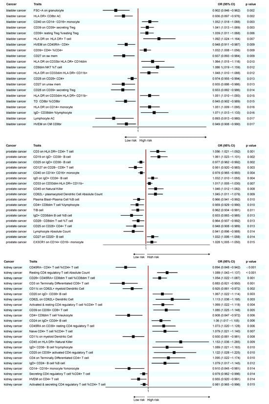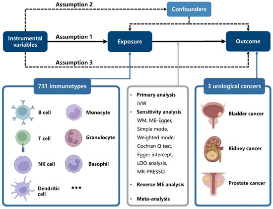 Mendelian randomization (MR) utilizes genetic variants (single-nucleotide polymorphisms, SNPs) as instrumental variables (IVs) of the exposure, which examine the cause-and-effect relationship with the outcome while reducing bias introduced by confounding factors; it is being increasingly used for inferring the causal relationships between traits. Several studies have adopted MR to infer the causality between immune cell traits and cancers, including breast cancer and malignant neoplasm of the ovary [,]. The aim of this study was to investigate the potential causal relationships between 3 common urological cancers and 731 immune cell traits using MR analysis. The results of our study can contribute to the development of blood-based biomarkers for early risk assessment, guide patient stratification, and inform future directions in immunotherapy research for kidney, bladder, and prostate cancers.