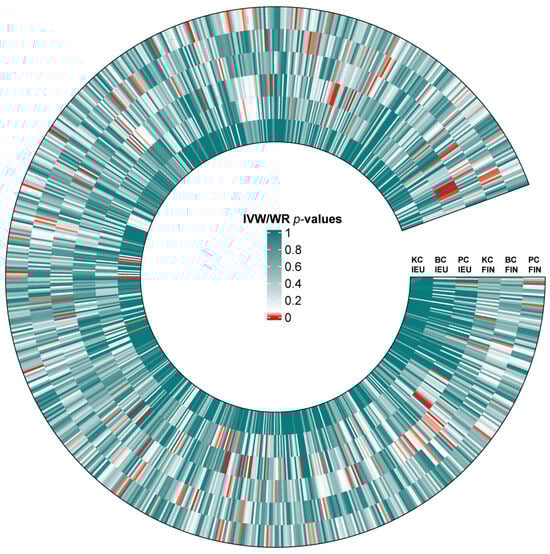 Heat map of IVW/WR estimates for three urological cancers from two databases. Standardized beta values of the inverse-variance weighted or Wald ratio (IVW/WR) are shown for associations between blood immune traits and kidney cancer (KC), bladder cancer (BC), and prostate cancer (PC) across two GWAS sources: IEU and FinnGen (FIN). The color of each cell represents the p-value of IVW/WR methods.