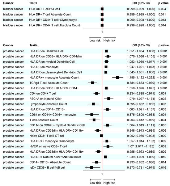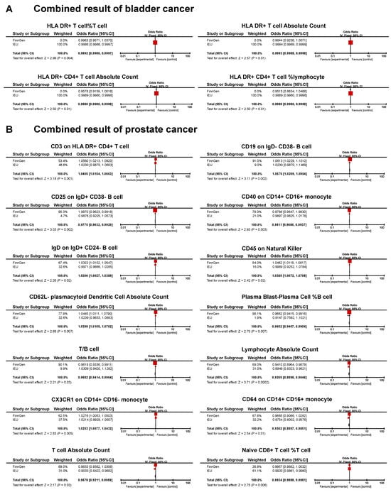 Data on immune cells were sourced from the publicly accessible GWAS Catalog (https://www.ebi.ac.uk/gwas/ (accessed on 16 February 2025)), covering registration numbers from GCST90001391 to GCST90002121. The genetic data regarding three common urological cancers were sourced from the FinnGen website (https://r10.finngen.fi/ (accessed on 16 February 2025)) and the Open GWAS database (https://gwas.mrcieu.ac.uk/ (accessed on 16 February 2025)). The GWAS IDs for the Open GWAS database are ieu-b-4874, ieu-b-85, and ukb-b-1316.