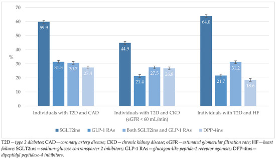 - Lim, C.E.; Pasternak, B.; Eliasson, B.; Danaei, G.; Ueda, P. Use of sodium-glucose co-transporter 2 inhibitors and glucagon-like peptide-1 receptor agonists according to the 2019 ESC guidelines and the 2019 ADA/EASD consensus report in a national population of patients with type 2 diabetes. Eur. J. Prev. Cardiol. 2023, 30, 634–643. [Google Scholar] [CrossRef] [PubMed]