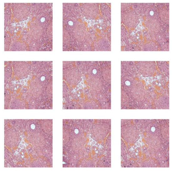 The complex dataset after an augmentation process contained histopathological images of adult Wistar female rat (280 g weight) vaginal tissue (control (216), alloxan-induced diabetes mellitus (405), and diabetes mellitus and antidiabetic therapy with a synthetic compound (AD_SC) (603), uterine tissue (control (288), alloxan-induced diabetes mellitus (270), and diabetes mellitus and antidiabetic therapy with a synthetic compound (AD_SC) (612)), and ovary tissue (control (333), alloxan-induced diabetes mellitus (666), and diabetes mellitus and antidiabetic therapy with a synthetic compound (AD_SC) (360)). Samples from each class are shown in Figure 2. The augmented images are shown in Figure 3, after applying augmentation.