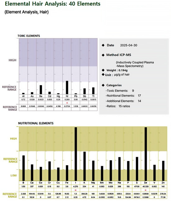 Hair samples (~2 cm) were collected from the occipital region, washed, digested, and analyzed using inductively coupled plasma mass spectrometry (ICP-MS). To minimize external contamination, hair samples were washed following a standardized protocol typically used in hair metal analyses, involving sequential washes with acetone followed by deionized water prior to digestion and ICP-MS analysis [21,22]. Metal concentrations were quantified using inductively coupled plasma mass spectrometry (ICP-MS) at the Korea Green Cross Lab (GC Labs, Yongin, South Korea). Calibration curves were prepared using multi-element standards, and quality control was performed using certified reference materials. Detection limits ranged from 0.001 to 0.1 μg/g depending on the element. Metals analyzed included Al, As, Be, Cd, Hg, Ni, Pb, Sb, Tl, Pt, Th, and U, among others.