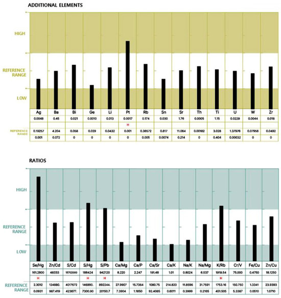 For each participant, a standardized hair mineral analysis report was generated, as illustrated in Figure 1 and Figure 2, using ICP-MS (Inductively Coupled Plasma Mass Spectrometry). These figures illustrate an example of a hair mineral analysis report that toxic and nutritional data was extracted for this study. The report included the quantification of 40 elements across four categories: toxic elements, nutritional elements, additional elements, and element ratios. Each element was reported in comparison to established reference ranges (low, reference, and high), allowing for individual-level interpretation. Based on these individual reports, group-level statistical comparisons were conducted to evaluate the differences in heavy metal concentrations between ALS patients and healthy controls. Both mean values and the proportion of individuals exceeding 50% of the upper reference limit were analyzed to assess potential associations.