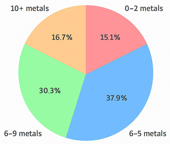 To further assess the cumulative exposure burden, we analyzed the number of metals in each ALS patient that exceeded 50% of the reference upper limit. As shown in Figure 3, 38% of patients had 3–5 elevated metals, 30% had 6–9, and 17% had 10 or more. Only 15% of patients exhibited fewer than three elevated metals. These results suggest that many ALS patients experience multi-metal exposure well above background levels, supporting the hypothesis that cumulative toxic stress is a possible contributor to disease etiology.