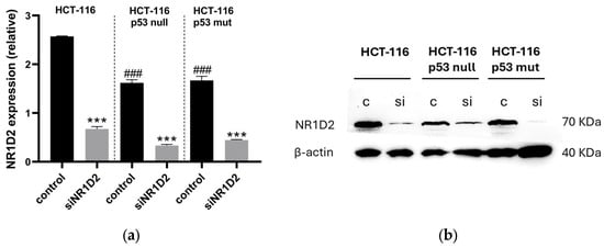 mRNA and protein expression of NR1D2 in the cell lines used in the in vitro model of this study, before and 72 h after transfection with siNRID2. Expression of the (a) mRNA and (b) protein in control and siNR1D2 transfected cells. *** p < 0.001 vs. control; ### p < 0.001 vs HCT-116 cells.