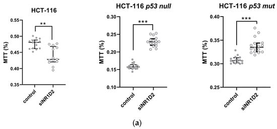 To study how NR1D2 affects CRC, we used an in vitro model with three commercially available isogenic cell lines: HCT-116 (p53 wild-type), HCT-116 p53 null (p53 silenced) and HCT-116 p53 mutated (knock-in of mutant at R248W p53 and knock-out of wild-type allele) in which this gene was silenced using siRNA technology.