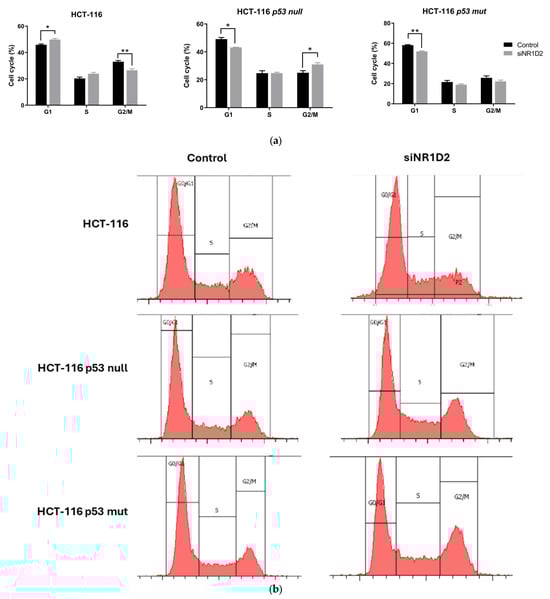 Regulation of cell cycle distribution by NR1D2 on HCT-116, HCT-116 p53 null and HCT-116 p53 mut cells. (a) Percentage distribution in different stages of cell cycle after NR1D2 silencing. Data represents the mean ± SD of three experiments performed in triplicate. ** p < 0.01 vs. control; * p < 0.05 vs. control. (b) Representative plots of control and transfected cells.