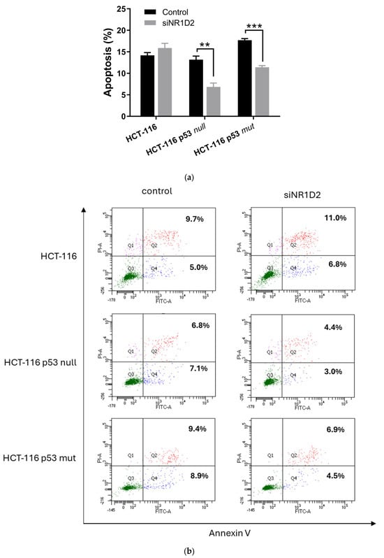 Effects of NR1D2 on cell death by apoptosis in CRC in vitro. (a) Levels of apoptosis of controls and transfected cells with siNR1D2 in HCT-116, HCT-116 p53 null and HCT-116 p53 mut cells. Results are presented as mean ± SD of three experiments performed in duplicate. ** p < 0.01 vs. control; *** p < 0.001 vs. control. (b) Representative plots of control a siNR1D2 transfected cells. Green: live cells; blue: apoptotic cells; red: late apoptotic cells.