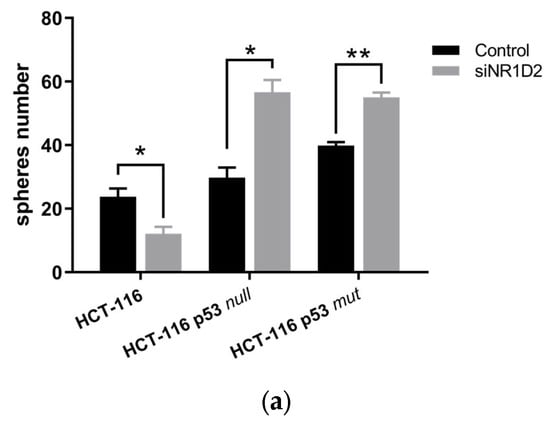 Finally, we studied the self-renewal capacity of cells after NR1D2 silencing analysing the sphere-forming faculty under free-serum conditions in an ultra-low anchorage-system. NR1D2 knock-down decreased the number of spheres formed by HCT-116 cells, while increasing it in HCT-116 p53 null and HCT-116 p53 mut cells (Figure 7).